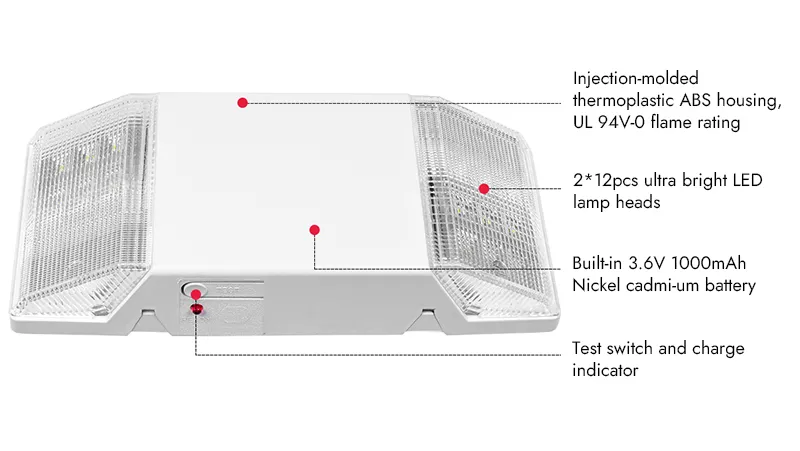 - Tiene dos cabezales de luz, cada uno equipado con 12 LED de alto brillo que se activan automáticamente en situaciones de emergencia.