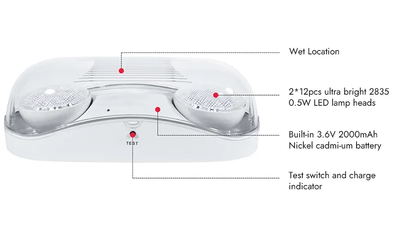 - Cuenta con dos cabezales de lámpara, cada uno equipado con 12 LED 2835 de 0.5 W ultrabrillantes, capaces de generar más de 400 lúmenes en modo de emergencia.