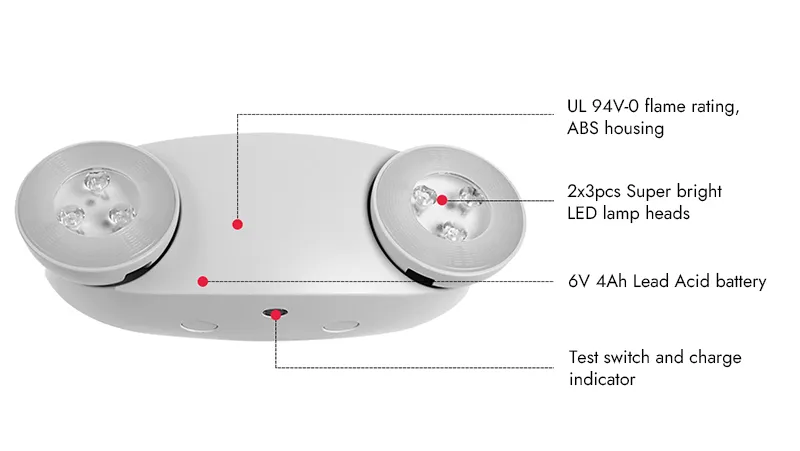 - Esta lámpara de emergencia de doble cabezal, certificada por UL y cUL, garantiza un rendimiento superior con más de 650 lúmenes de iluminación.
