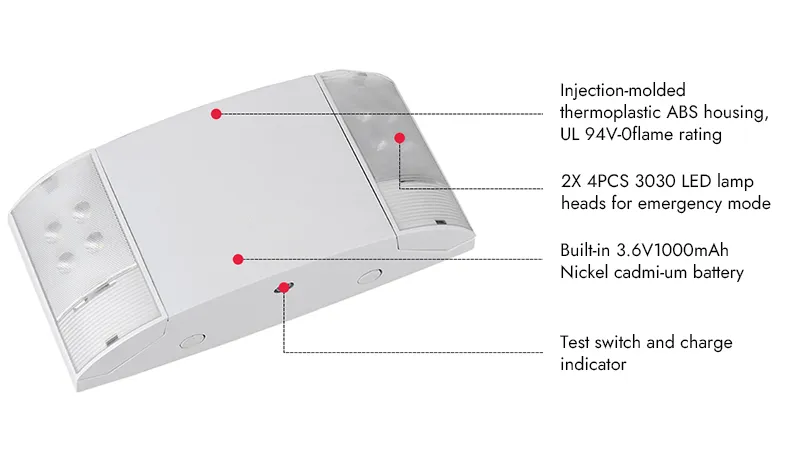 - Cada cabezal ajustable cuenta con cuatro LEDs 3030 que proporcionan más de 200 lúmenes en modo de emergencia.