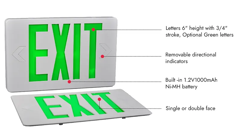 - Esta señal de salida de 15 cm combina un diseño estilizado con la confianza de la certificación UL, disponible con letras rojas o verdes.